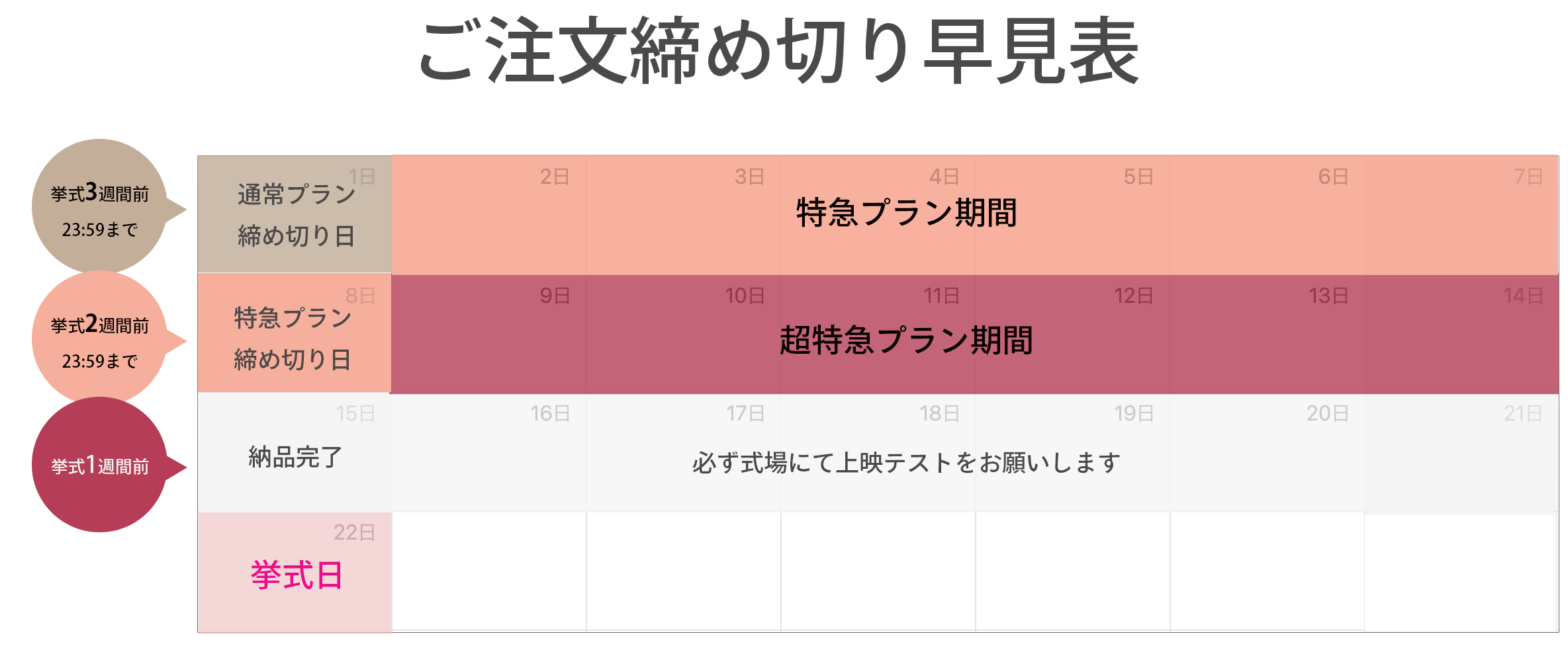 <重要>納品プランは、挙式日から、決済時点が何日前に当たるかでお選びください。(挙式日前日を1日前とします。)